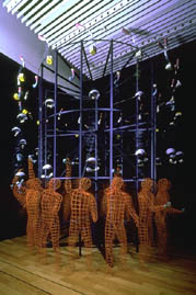ICCから常設作品を委嘱されたバーサミアンは,ヘッドフォン型の受話器など,さまざまな電話の形式を実際に試したそうです.作家は,テレコミュニケーション・テクノロジーの進展する現代において人間がどのように潜在意識的な反応をしているかを研究したのです.電話は「人間と機械間のエレクトロニック・インターフェイスの最も親密な象徴」であり,変容する電話のイメージは,「近代的コミュニケーションの葛藤」つまり「希望」と「警告」を表現しています.投げ上げられた受話器は,哺乳瓶,ミルク,さいころ,骨へと変形しながら,最後には,パラシュートでスピードをゆるめられ,もとの受話器となって,かろうじて曲芸師(人間)の手に戻って来ます.それは,シジフォス神話のように反復されます.バーサミアンの作品の中で,上昇と下降の動きをもつ作品は,現在この作品のみです.《ジャグラー》は,バーサミアンの彫刻アニメーションの一つの到達点を示しているということもできましょう.