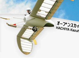 《M-01》の設計改良型2号機.実際に飛行可能なモデルで,初期トリム(微調整)やゴム索発航によるテストはこの機体で行なわれ,今まで5回,合計62本のフライトをこなしています.会場に展示されている飛行中の写真は,すべてこの機体で撮影されたものです.