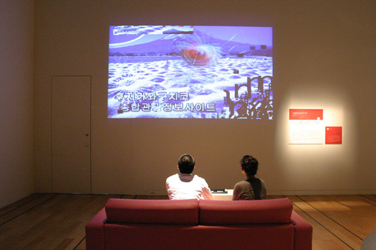 作品のタイトルには,「Fragment(断片)」「Mental(精神の)」「Storm(嵐)」が含まれています.エキソニモはこの作品を,ウェブ上のデータを世界中に広がった一種の「脳」とみなし,キーワードにより分散している断片が集められ嵐のように交差する,という構想から2000年にVer.1を発表,《FMS02》はそのVer.2となっています.つねに変化しているウェブ上のデータを素材とし,またランダムな表示機能によって同じキーワードでも毎回異なった展開があらわれます.既存のデータをリミックスするこのソフトは,20世紀初頭に実施された偶然によるコラージュや現代のDJ,VJに共通する姿勢を自動的かつダイナミックに実現するものといえます.多くの作品がその存在意義を表現「コンテンツ」に依存するのと比べ,《FMS 02》は既存のデータを流動的に操作する「システム」を作品とすることで,ネットワーク時代の情報共有そして新たな創造のあり方を呈示しています.このソフトはまた,他の機器とつなげるなどユーザーが自由な発想で使いこなしていくことを歓迎しています.