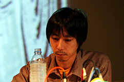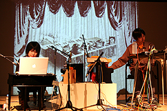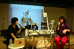 音楽と美術作品の間にあるものについて,作品が持つ童話的,箱庭的世界に ついて,普段は「わき見」をしないと見えないような,ちょっと忘れられて しまった感覚についてなど,対談形式でお話を伺います. また,ゲストにHarpy,gnu,d.v.dなどといった多くのグループ,ユニット で活動する(偽?)マルチ楽器演奏者イトケンを迎え,音楽家「すずえり」 としてトイピアノによる玩具音楽ライヴを行ないます.