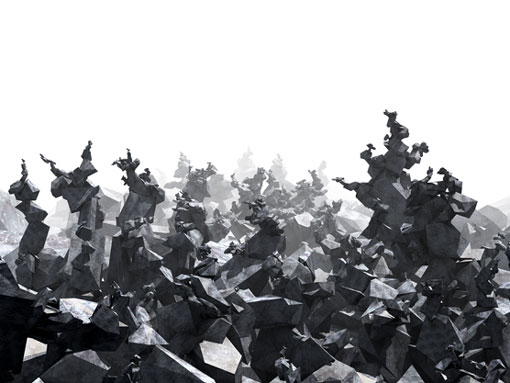 人間は映像の中のささいな光の変化から,物理的には存在しない空間を知覚することがあります.このような現象に対して,工学や建築などの分野でいくつもの試みが行われてきました.この作品は,そういった試みの中でも仮想空間デザインの制限について思索したものです.重力という制限のない仮想空間において,速度の調整や,それに伴う快感がデザイン上の要点になるという着想と,クラブカルチャーにおけるVJ手法を結びつけるアプローチをとっています. また,この作品で描かれるストーリーは,非人間的な秩序が支配する無生物世界のファンタジーです.再帰関数によって生成する自己相似構造をもつ無機生命体(ナノマシン)が成長・暴走し,世界を美しく作り変えてゆく様子が描かれています. さらに今回の展示のため,映像ストーリーの根幹をなす自己相似構造という題材を共有する音楽が新たに作曲されました. ![]() 音楽作曲:宮内康乃 エマージェンシーズ! 004