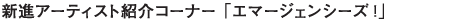![]() 「エマージェンシーズ!」は,これから期待されるアーティストやクリエイターの最新の作品やプロジェクトをいち早く展示するコーナーです.年間3,4回のペースで,アートや科学の新しい可能性を開いていく実験的な表現を幅広く紹介していきます.メディア・アートにおいて現在生まれつつあるものをリアルタイムで体験いただくとともに,それらを生み出すアーティストたちの発想の源泉に触れていただく場となることを期待しています.
