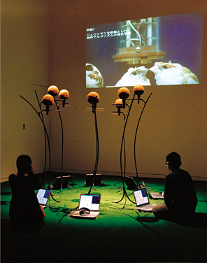 "Call ⇔ Response" 2007 Software modeling the syrinx, a bony organ birds use to produce vocalizations, continuously generates various simulated bird calls. When a response is heard from a natural bird, the software initiates a self-teaching process, subtly changing and refining its calls. As this process is repeated and birds and computer influence each other, this installation attempts to create the opportunity for a new kind of communications that goes beyond the human word. Technical support: KAMIYAMA Yusuke Production support: International Media Research Foundation |