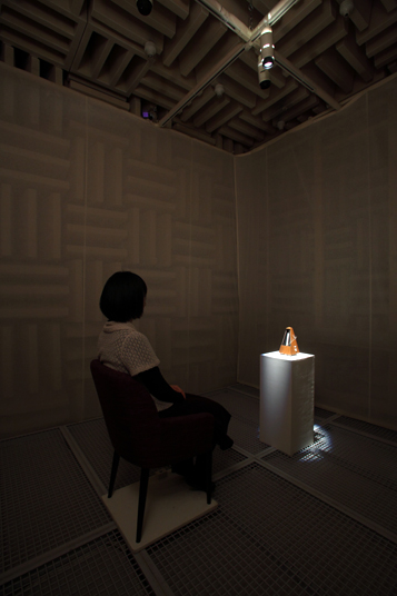 この作品が設置されている無響室は,部屋全体が音の反響を吸収してしまう素材で囲まれています.わたしたちは通常,空間の広さなどを音の反射によって把握しているため,それが排除された空間である無響室では,メトロノームの音に「現実感」のなさや「不自然さ」を感じるでしょう.さまざまな空間で録音されたメトロノームの音は,周囲の空間の反射音を含んだ音響として録音され,それがバイノーラル録音と,それをスピーカーによって再現する立体音響技術によって,実際にメトロノームの置かれた無響室の空間で擬似的に再現されます.それによって,無響室という「現実感」のない空間と,立体音響技術によってもたらされる擬似的な「現実感」のある空間という,ふたつの空間性が対比され,場所や空間について,わたしたちがどのように「現実感」を認識しているのかということを考えることができます.