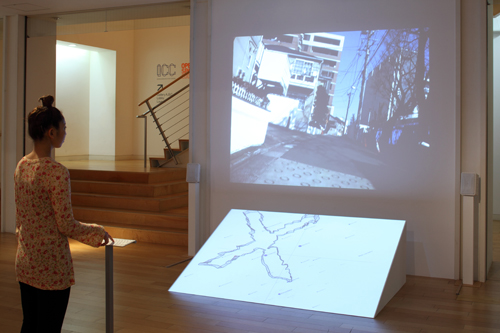 キーボードからアルファベットを入力すると,独自にデザインされたフォントがスクリーンに現われます.これらの文字は,渋谷区全域を移動した位置情報をGPSによって取り出した,その軌跡によって作られています.それは,都市を構成する街路という,いわば都市のかたちによってデザインされたフォントと言えます.たとえば,コンピュータで使用されるフォントには,都市の名前を持つものが多くあります.そのフォントのデザインと都市,およびその名称とがどのような関係にあるのか,という関心から制作された作品です.映像は「Shibuyaフォント」を制作した際の,移動のドキュメントとなっています.
