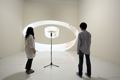 部屋の中央にパノラマカメラが設置されています.このカメラは,半球上の鏡に反射された像を撮影することにより,周囲の全景をとらえることができます.撮影された映像はコンピュータ・ソフトウェアによって円筒状に変形され,リアルタイムで壁面に投影されます.また,ときおり現われるもう一つの円筒には,事前にその空間で録画された作者自身の映像が同様にマッピングされています.