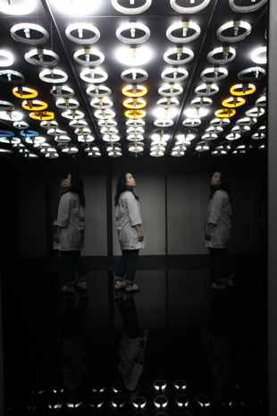 In this installation fluorescent lights flash on an off in response to the movement of viewers passing along a narrow passageway and sounds are generated in response to the lights. Initially the flashing lights glare in your eyes and the random sounds sound like static noise, but in time the movement of the lights may seem to have a certain regularity and the movement of the sound seem somehow rhythmical. Moreover, surrounding them in a transformed space influences the viewers in various ways.