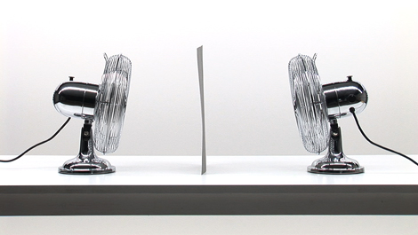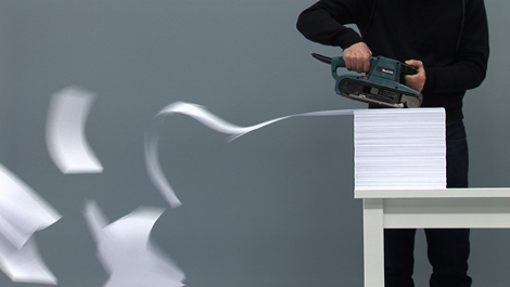たとえば,《もう1km》では,電動ヤスリがA4サイズの紙の束を削るように一枚一枚飛ばしていき,紙の束が紙の連なりによる長さ(1km)に変化する過程がとらえられています.《扇風機/紙/扇風機》では,紙が左右に置かれた扇風機からの風によって,その中央で直立します.