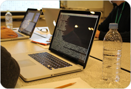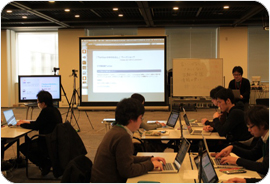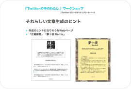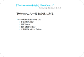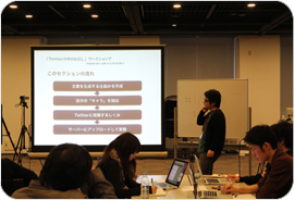 1日目の思考編では,Twitterを「メディア」と「コミュニティ」という視点から捉え直し,ネットワーク・サーヴィスとの付き合い方について考えました.システム的観点からTwitterに触れてみることで,つぶやきとそこでのコミュニケーションがアーキテクチャによって影響されることを体験できました.ネットメディアの特質によって取得する情報が偏りがちになっていることや,知らずに利用されるつぶやきの事例からプライヴァシーの意識についても言及されました.パブリックに発言することについて無意識的であることや,140字という少ない文字数で投稿するいったTwitterのアーキテクチャから,つぶやきには「わたしっぽい」ところが反映されやすいのではないかと話されました.