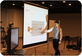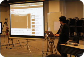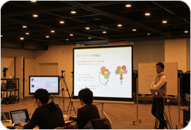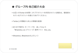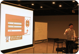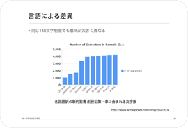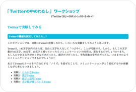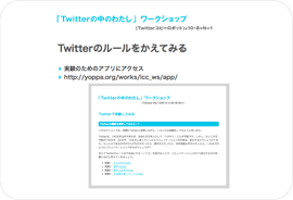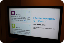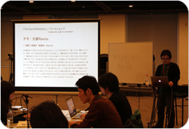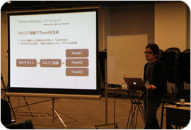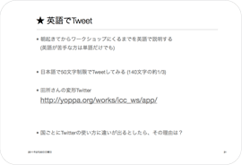 Twitterは140字の文字制限がありますが,その140という数はメッセージに意味を込められる最低文字数ということではなく,SMS(ショート・メッセージ・サーヴィス)の140字制限が由来であると話されました.また,言語の違いによって140字で表現できる意味内容には大きく違いがあり,日本語は英語に比べて約3倍の情報量を込めることができ,中国語においては英語に比べて約4倍もの情報量をもつというデータが示されました.それらをふまえ,Twitterで入力できる言語や文字数を変更することでコミュニケーションに何か変化がもたらされるかどうかという実験が,田所氏の作成したTwitterの独自インターフェイス(http://yoppa.org/works/icc_ws/app/)を使って行なわれました.