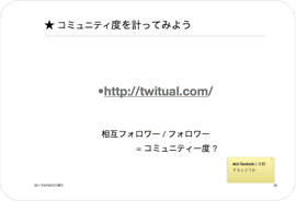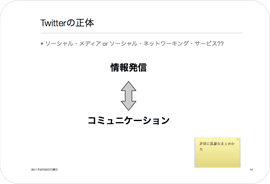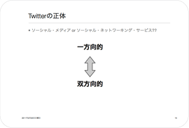Twitterには情報の発信と収集を主目的とするユーザ,コミュニケーションそのものを楽しむユーザが混在しているように思われます.つまりTwitterはソーシャル・メディア,ソーシャル・ネットワーク・サーヴィス(SNS)の両方の性格を併せ持つサーヴィスと言えるのではないでしょうか.また,相互フォローの割合などからおのおのの実社会での人間関係の密度をも垣間みることができるのではないかという考察が行なわれました.