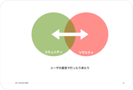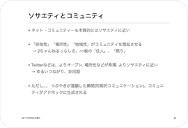 ちなみに速度が速くなったように見えるのは,そこでのコミュニケーションがフローだからですよね.だってストックならば,1000件のコメントでも1万件でも,読みたければ後でじっくり読めばいい.でもフローなので,今現在積極的に更新しているその1000人に付いていかなくてはいけないように思ってしまう.フロー性の高いコミュニケーションは,コミュニケーションの量が増えていけばいくほど,言い替えれば「追いつけない!」と思えば思うほど,「追いつかなきゃ!」って思わせるようになる.