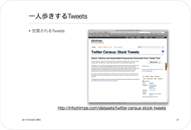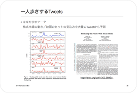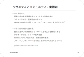 でも,Twitter上の発言なのか,それとも個人の発言なのかが分からない情報って,日常会話の中にもたくさんあるし,本人もその区別がつかずに喋っている場合だってある.本来的にはTwitterだって「One of them」の情報でしかないはずだけど,でも何となく「これってみんなが考えてることだろうな」という,まさに「One of them」として直感的に聞く場合とそうじゃない場合があって,人間の能力がけっこう凄いのは,そういう判断をある程度瞬間的に把握できたりするんだよね.