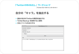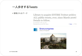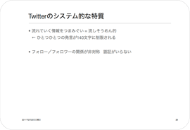 僕の考えでは,ただ,やはりTwitterはリアルタイム性を強調しているし,その部分をオプティマイズしているサーヴィスだから,「このスピードだから言える」という,ある種「2ちゃんねる」的なヴァリューがあるんだと思います.そこで「どういうふうに(テキストを)書いているのか」というのは,たぶん長期的には,サーヴィスを提供する側が見たいのかな,という気もしますね.たとえばマーケティング・ツールとしても,すごく使えると思う.