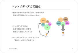 ネットメディアとマスメディアを比べたときに,情報を能動的に選択し深く掘り下げることができる点がネットメディアの利点であると言えます.一方,全く同じ理由で,接する情報が偏りがち,すなわち情報の偏食状態に陥る危険性もはらんでいるとも言えるのではないでしょうか.情報というものに対して,受動性と能動性のちょうど良いバランスを取るにはどうすれば良いのかというディスカッションが進められました.