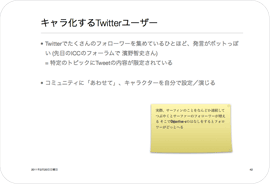 先ほどの「Twitter上の有名人は,自分自身をボット化できる能力の持ち主である」という話に立ち戻りますと,それって要するに,ある特定のパターンでつぶやけたり,コミュニケートする能力があるということですよね.つまり,ある程度自分をキャラ立ちさせることがうまい人というのは,「自分自身をボット化するのがうまい人」でもある.ある意味,お笑い芸人の「キャラ」に近いものといえる.そこには,ユーザの間で安定して予期されるつぶやきのパターンが共有されるからこそ,そこに愛着が湧いたり,「ツッコミ」を入れやすくなるという構図があるわけです.