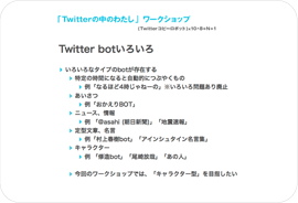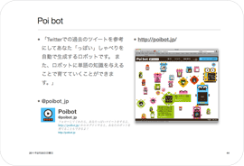 Twitterを使っていると「つぶやく」という行為から「わたしっぽさ」というものが表われやすく,「わたしっぽさ」をうまく定型化しその人のキャラクター性がわかりやすい人ほど,フォロワー数が高くなる傾向があるようです.定型文を繰り返しつぶやく「ボット」というものの性質と「キャラ化するTwitterユーザ」との類似性などについて議論されました.また,講師が関わるプロジェクト『Poi bot』が紹介されました.