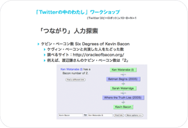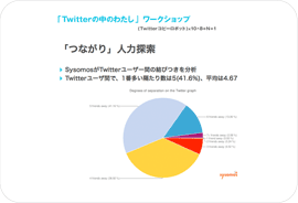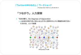 Twitterのアーキテクチャ上で「わたしたち」はどこまで繋がっているのかを探索しました.はじめに,ネットワークでの情報のつながりを体感するため, Wikipediaのサイト内で任意のワードとワードをWikipedia内のリンクだけでたどれるかどうかを試しました.まったく関係のなさそうなワードであってもワードを包括する大きなカテゴリを見つけることにより,少ない回数でたどり着けることがわかりました.次に,自分がTwitter内でフォローしているユーザをたどって見知らぬ特定の人にたどり着くかどうかを人力で探索しました.ソーシャルメディアの統計分析サービスSysomos(http://www.sysomos.com/)の分析によると,Twitterではほとんどのユーザが4ステップか5ステップでつながっていて,その平均は4.67ステップだったそうです.