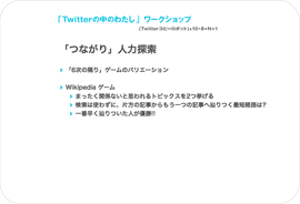2日目の実践編では,インターネットのリンクによるつながりの距離感を体感することから始まりました.Wikipediaの任意に抽出したワードは予想しているより短かいステップ数でリンクしていることを実感し,Twitterのアカウント同士もリストなどから辿っていくと意外に少ないステップ数で繋りあっていることを実感しました.1日目の「キャラ化するTwitterユーザ」という思考を受けて,「わたしっぽさ」を反映させたボットの制作を通して,自分のキャラクターというものを客観的に見ることで「Twitterの中のわたし」というものを捉えてみようとする試みを実践しました.ボットを制作する過程には形態素解析やマルコフ連鎖というアルゴリズムが必要とされるのですが,プログラムのアルゴリズムに重点を置くのではなく,形態素解析やマルコフ連鎖を使うことで生成できるつぶやきから「わたしっぽさ」を認知することを重視し,あらかじめ用意されたプログラムをコマンドで実行するだけの手順でボットが制作されました.「わたしっぽいボット」がつぶやく意味不明な言葉から,「わたし」のプライベートなつぶやきの一片や文脈が分断されつつも「わたしっぽさ」を感じるつぶやきに,Twitterのアーキテクチャに影響を受けた「わたし」を感じることができたのではないかと思います.