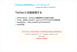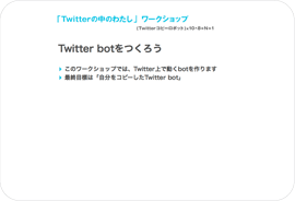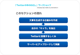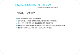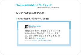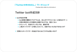 当初ICC側で「Twitterの中のわたし」というテーマを掲げられたとき,この研究会の方向性として想定されていたのは,おそらく「Twitterユーザの無意識を顕在化する」仕掛けを作ろう,的なものだったのではないかと思うんです.でも,そもそもTwitterをうまく使えている人というのは,「無意識を消している」と言うべきなのか,あるいは「自分を(無意識的に)ボット化できている」と言えばいいのか……そのあたりは自分もまだ考えが詰まっていませんが,そういう傾向があることは間違いない気がします.