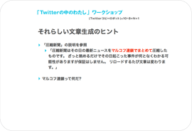 次に,現状の「Twitterの使われ方」に対する僕自身の懸念というか,心配事をお話ししておきましょう.「Tweet(ツイート)」という,より無意識に近い言葉に「つぶやき」という日本語を当てたのはすごく秀逸な翻訳だと思います.そういう「つぶやき」が,既存のジャーナリズムやマスメディアに影響を与えたり,社会的にも新しい局面を形成していることには100%同意したうえで今,欧米のマーケッターやSEO業者などが共通解として言っているのは「Twitterをニュースフィードとして使おう」ということです.つまり,影響力を持っている人がいて,その人物やその周りにいるコミュニティのフィードを自分のタイムラインに流すことによって,いち早く情報を探知できるツールとして使っていければいいよね,みたいな話です.