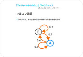 未来の挙動が過去の挙動とは無関係に現在の値だけ決定されるという確率過程のことを「マルコフ過程」といい,その状態が連続しておらず離散的なものを「マルコフ連鎖」と呼びます.ある状態[B]から他の状態[C]へ遷移する確率が,ある状態 [B]になる前の状態[A]には依存しないということを意味します.たとえば,「わたしはワークショップに参加している」という文章が生成された場合,「ワークショップに」の次に来る文節の確率だけで選択されたのが「参加している」という結果であり,この結果に「わたしは」という文節が「ワークショップに」という文節の前にあることは無関係ということです.