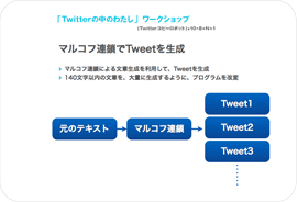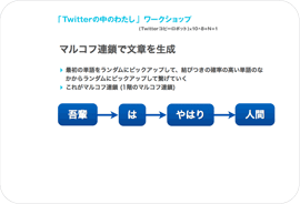 今回のワークショップでは,今まで自分が発言したツイートの全ての単語同士の結びつきをカウントし,その確率を計算しています.その単語同士の結びつきの強さを利用することで,ランダムな単語から文章を生成することが可能となります.実際には文脈や意味を一切考慮していないのに,あたかも自分のキャラクターを分析したような「わたしっぽい」文章が自動的に生成されるのです.