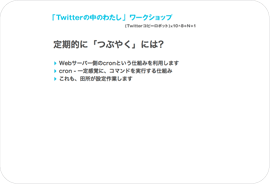 今回のワークショップで制作するボットは,あらかじめ形態素解析とマルコフ連鎖によって生成した10000個の「わたしっぽいつぶやき」の中からランダムに選ばれた1つのつぶやきが自動的に投稿されるという仕組みのボットです.定期的につぶやきを投稿するため,Webサーバ側のcronという仕組みを利用しました.