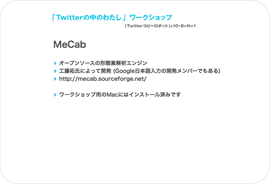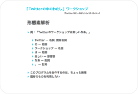 抽出したつぶやきを再構成するために,まずは文章を「形態素 (=言語で意味を持つ最小の単位)」に分ける必要があります.日本語は英語と違って分かち書きをする習慣が無いため,単語の区切りがわかりません.そのため単語の結びつきを調べる前に,まず形態素解析を行なう必要があります.このワークショップではMecabというオープンソースの形態素解析エンジンを使いました.