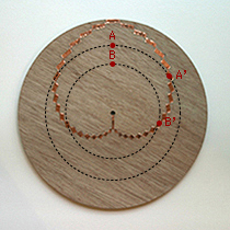緻密な計算にもとずいて切り抜いた銅板が貼られた木製円盤(図2)をレコードプレイヤーにのせ,一定の速度で回転させます.観客がスイッチを押すと,円盤上の銅板に電気が流れ,円盤上部に固定された銅芯と接触することで,20個のベルに等間隔に順々に電気が送られ,ベルが鳴るしくみになっています.