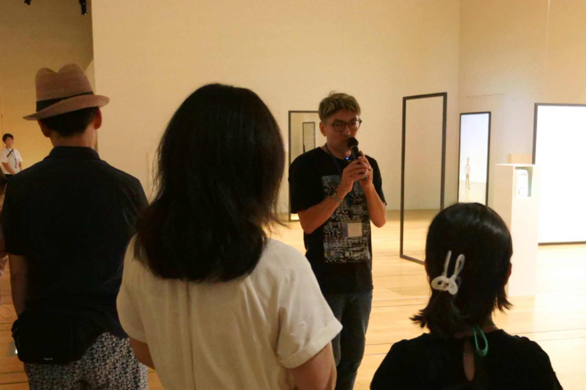 作家が作品をどのように体験してほしいか,またどのような意図を込めて制作しているか,「AR Audio Guide」を用いることを前提とした展示をするにあたって,作家の皆さんとAR Auidio Guideチーム,ICC技術スタッフがどのような試みを行なって展示が完成しているかを,それぞれの展示室を巡りながらの説明に参加者の皆さんも興味を示してくれている様子が伝わります.
