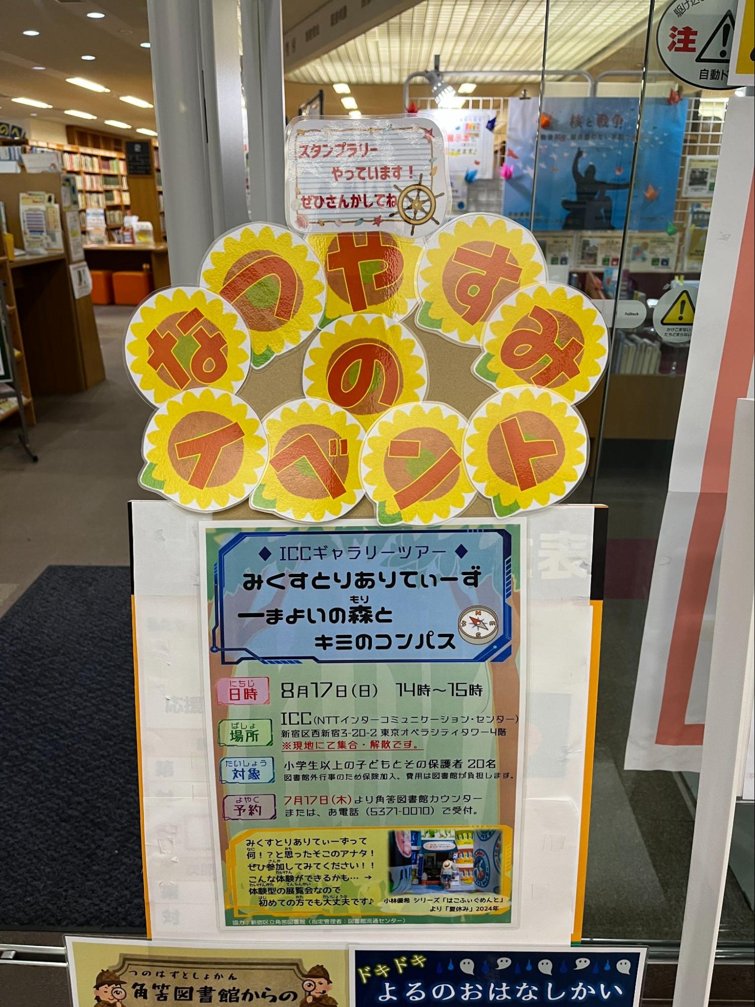 新宿区立角筈図書館は,ICCから徒歩圏内にあり,西新宿小学校に通学するお子さんをはじめ,近隣にお住まいの方達の利用も多く,イヴェントの開催が決まってからは図書館の入り口にもギャラリーツアーのお知らせを図書館スタッフのみなさんが作成してくださっていました.