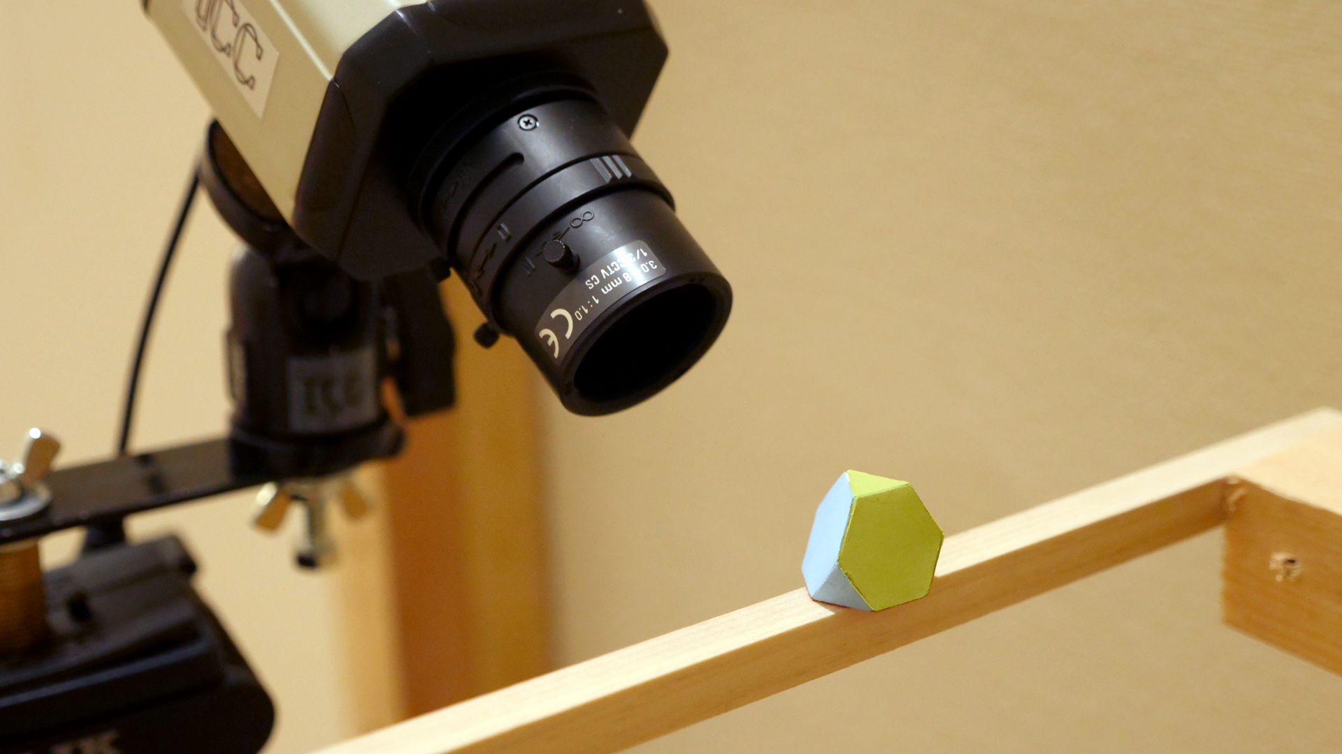 オブジェは全て同じ形と色をしていますが,それぞれ大きさが違っていて,映像の中ではオブジェの大きさが揃って見えるように調整されています.そうした仕組みのために,オブジェとカメラの位置関係は緻密に決められていきました.