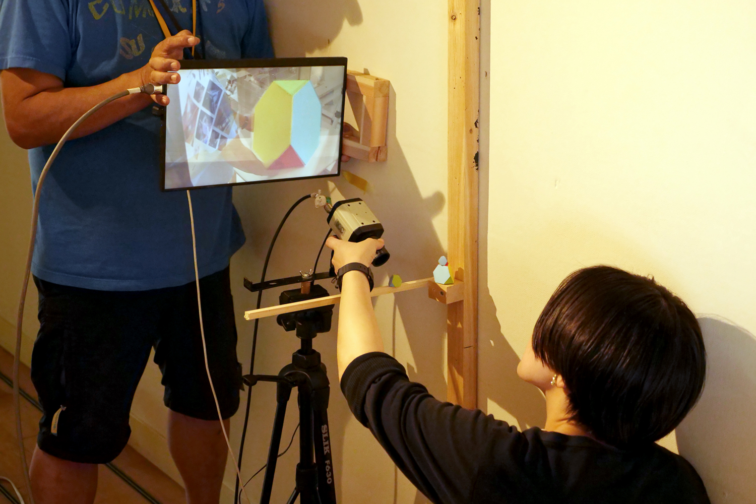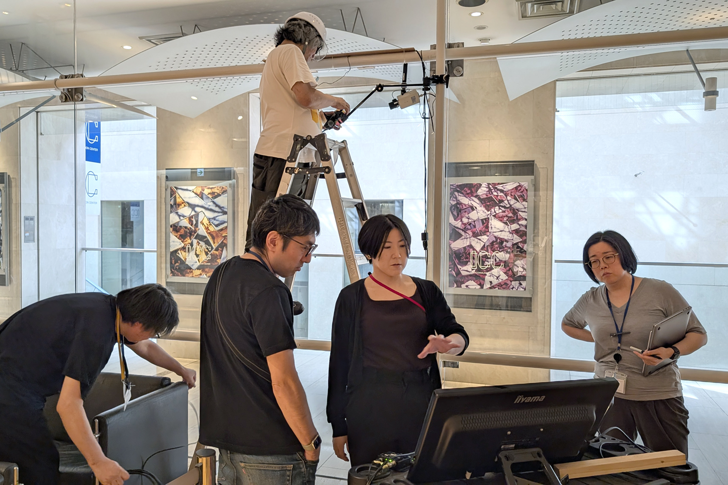 オブジェとカメラの位置を確認する平瀬さん(右から二番目)とICCスタッフ