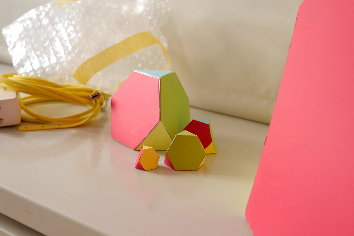 《氷山の一角——いいかげんできまじめなドリフト》は,切頂四面体(せっちょうしめんたい)と呼ばれる形状のオブジェを中心とした作品です.同じ形と同じ色で彩色された切頂四面体のオブジェが会場内に複数個配置され,それぞれがカメラで撮影されています.その各所で撮影されたオブジェの映像は,複数が透過して重ね合わされ,各オブジェの近くに設置されたモニターやプロジェクターで中継されています.
