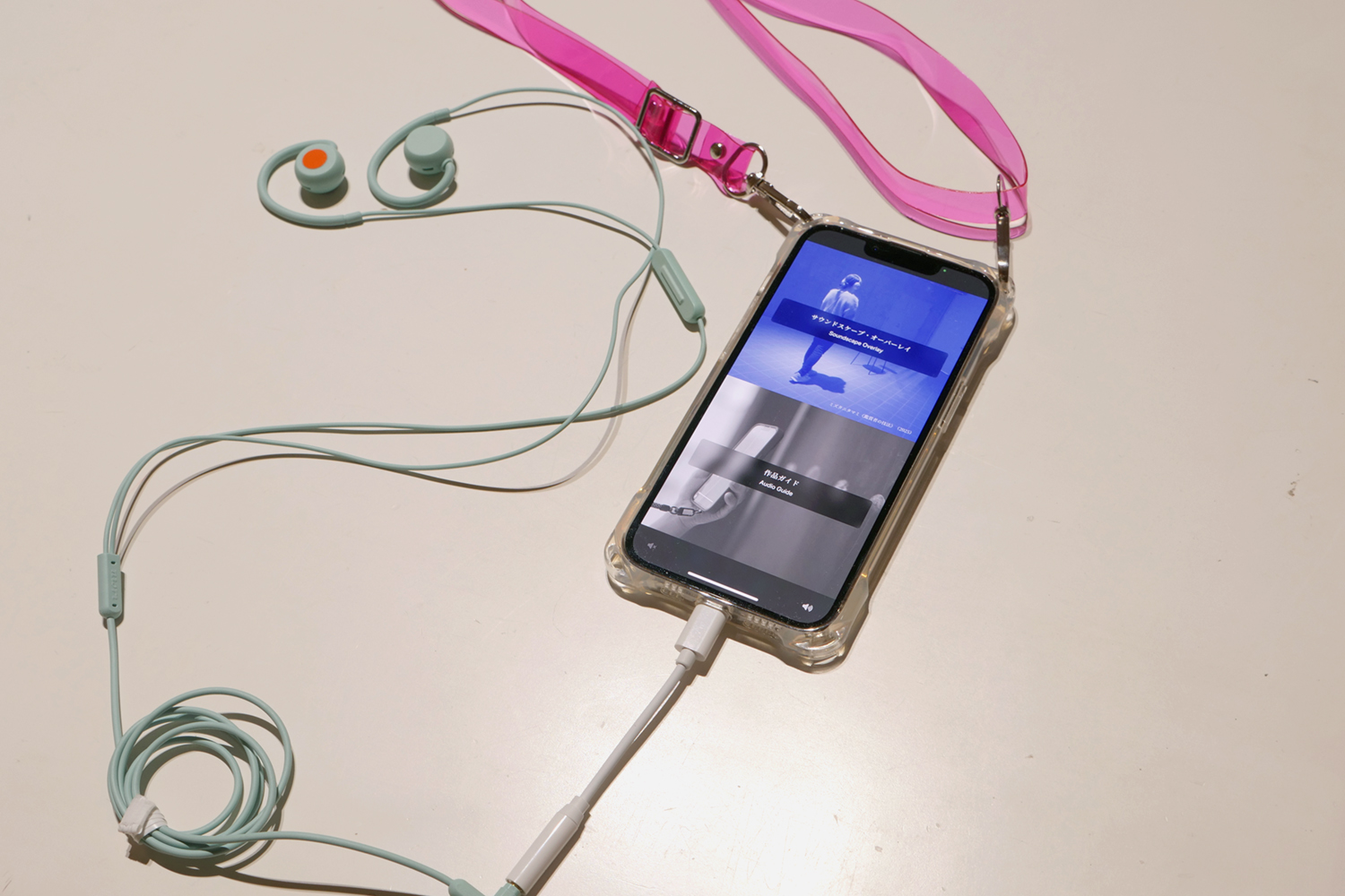 本展で導入された,AR技術を用いた音声ガイドのシステム「AR Audio Guide」の「サウンドスケープ・オーバーレイ」機能では,別のオブジェがある場所の環境音がリアルタイムで聞こえてくるようになっていました.この音の聞こえ方と,映像上のオブジェの重なり具合が連動していて,映像上でオブジェがうまく重なってくると,ラジオのチューニングが合うようにノイズが消えて音がはっきりと聞こえてくるようになる,という仕掛けが含まれていました.AR Audio Guideとしては,リアルタイムで音をストリーミングする機能は本展で初めて実装されたことになります.