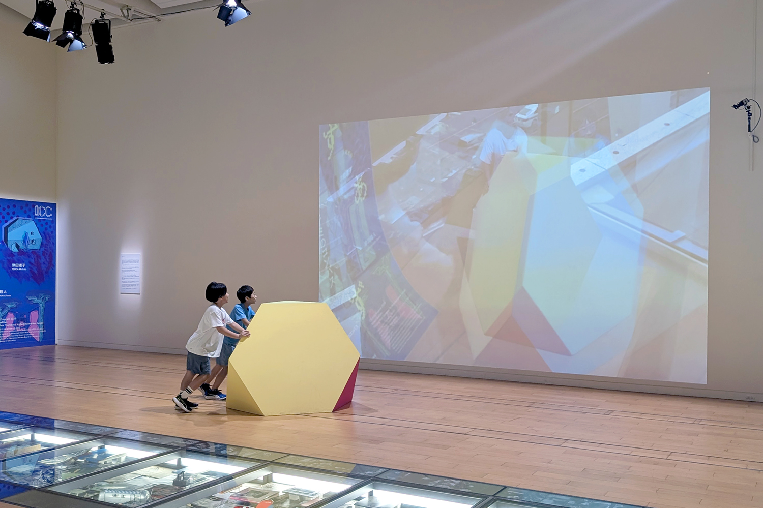 展示されたオブジェの中で最も大きいサイズのものが,キッズ・プログラムの展示室の入り口手前のロビーに置かれ,作品の説明がなくとも,鑑賞者が自然とそのオブジェに触れて動かしてみるという行動が誘発されているようでした.さらに,自分がオブジェを動かしている様子が目の前のプロジェクションに映っていることに気が付けると,それを意識しながら,透過して映っている他のオブジェとうまく重なるよう試行錯誤し始める鑑賞者の姿も多く見られました.