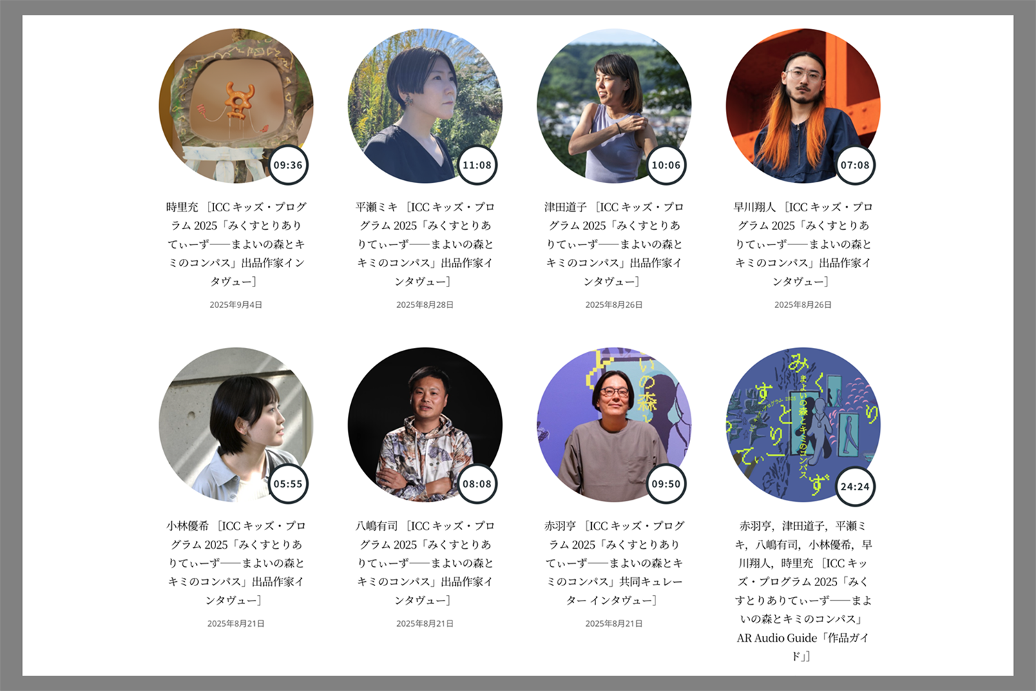 ICCのポッドキャストとYouTubeチャンネルでは,ICC キッズ・プログラム 2025参加作家による作品解説の音声コンテンツを配信しています.作品や,過去を含めた作家の活動などについて詳しくお話ししていただいています.展覧会は終了しましたが,音声は引き続き公開しています.ぜひお聞きください!