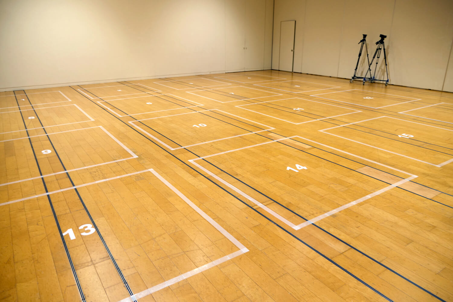 イヴェント会場の床には,1〜16の数字と,それを囲む正方形の白い枠が一定間隔で並んで示されていました.数字ごとに異なる音が仮想空間上でマッピングされており,AR Audio Guideとイヤホンを身につけてその枠のエリアに入っていくと,車の走行音や踏切の警報音など,街中の環境音が聞こえるようになっています.視覚的には床面の数字と白い枠があるだけですが,並んだ白い枠が街の区画のようになっていて,各所で聞こえる音から,学校や公園があって,近くに川が流れていて…など,街の姿を想像できるよう設計されています.