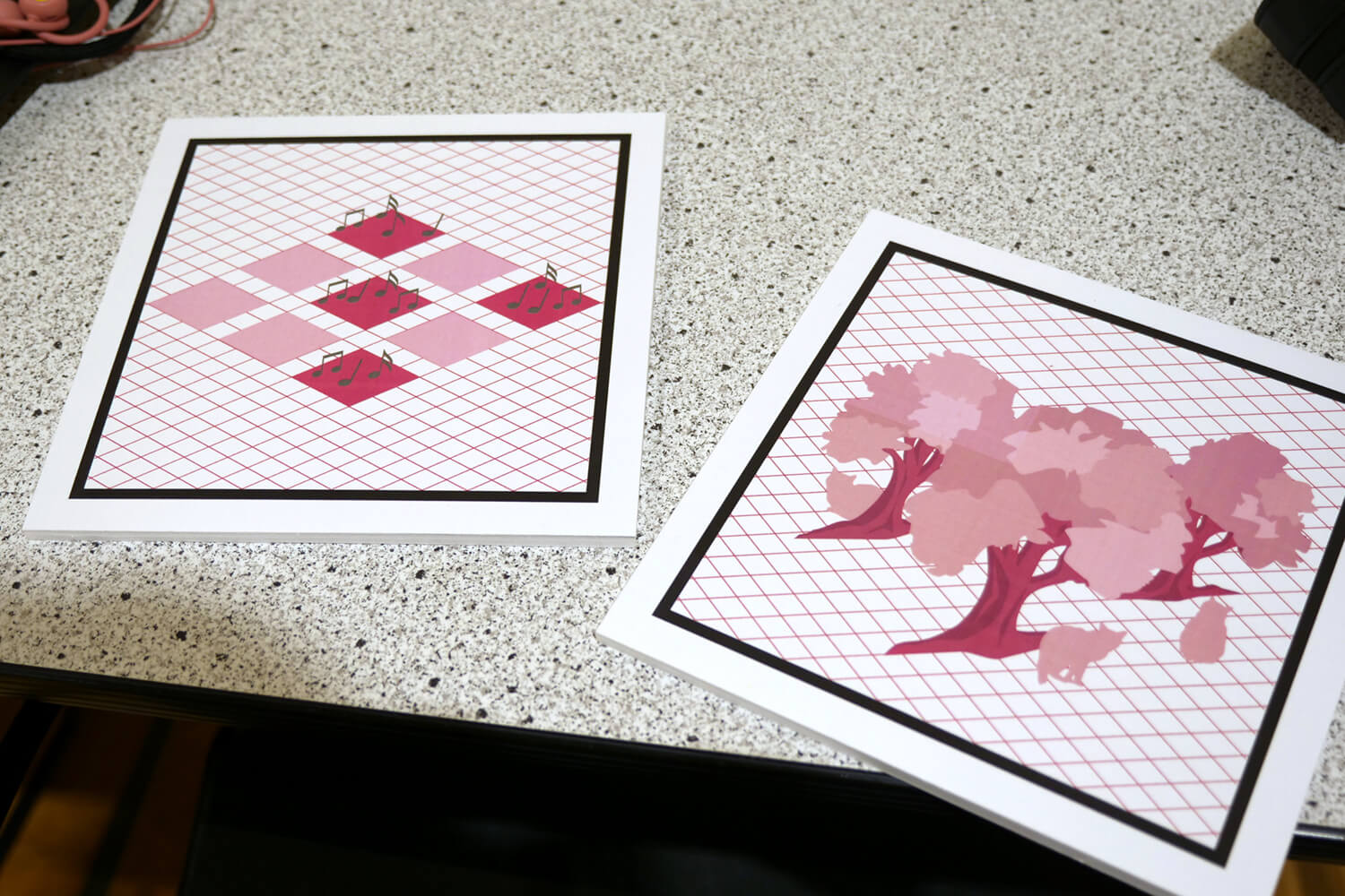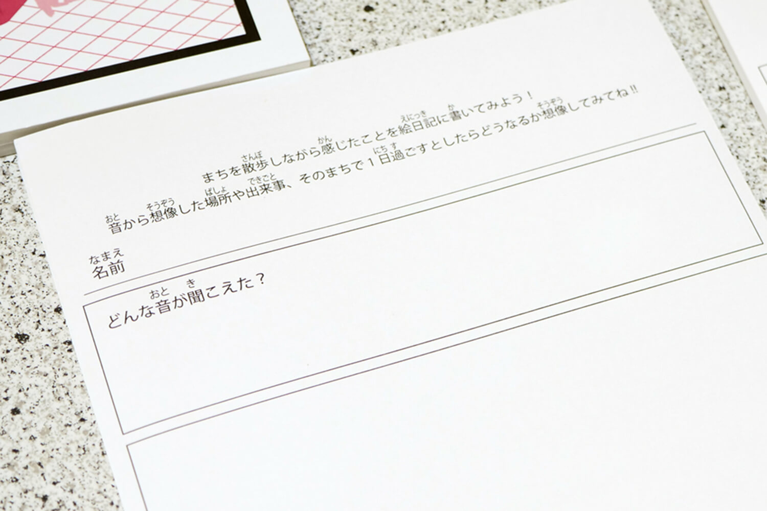 次のステップでは白紙のメモ用紙が配られました.ステップが進むごとに異なるイラストのマーカーが用意され,違うマーカーを読み取ることで,マッピングされた音の位置や種類が変わっていきます.この時は3ヶ所の枠の中で音を聞くことができ,それらが何の音で,どんな景色が想像できるかを考えながら,言葉やイラストをメモにかき込んでいきます.お子さんたちからは,場所ごとに猫の鳴く声や風鈴の鳴る音が聞こえたなど,具体的なイメージが共有されました.