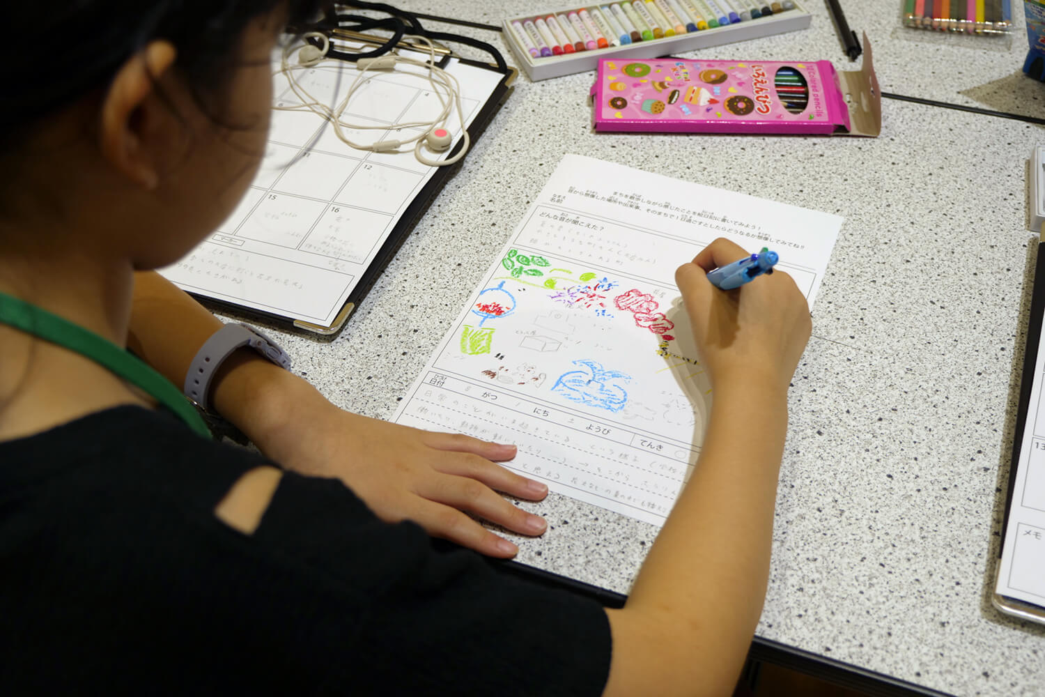マップがある程度完成してきたら,自分ならこの街でどんな1日を過ごすかを考え始め,メモを見返しながら絵日記にまとめていきます.「踏切を渡った先にある滝を見に行った」や,「家の縁側で,風鈴の音を聞きながら犬と過ごした」など,具体的な情景を絵と言葉で表現してくれていました.絵日記の内容を共有してくれた子は,「自分が好きな図工のクラスが多い工作の学校」というテーマで絵を描いてくれました.