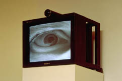 「ビッグ・ブラザーはあなたを見ている.」彼はひそかにあなたを見張っている.だがこのインタラクティヴ・インスタレーション,『アイ(私/眼)』は,その疑い深い眼差しを,あなたや他の通行人にあからさまに向ける.『アイ(私/眼)』はヴィデオ・モニターいっぱいに映るほどの巨大な目だ.それはただあなたを見つめるだけではない.あなたの動きを追って動くのだ.はじめは自分こそが見る者だ,この見るゲームの主導権をにぎっているのは私だ,と思っていたあなたは,自分もまた見られていることに気付く.『アイ(私/眼)』のためにスピンホーフェンは,実にさまざまな向きの自分の目を撮影した.コンピュータのプログラムによって,それが刻々とショットされる見る者の実在に反応するのである.『アイ(私/眼)』の目と目が合うことによって,物のように監視され,目で後を追われるということがどのようなものか,身をもって体験される.控えめに言っても,それは両義的な体験なのだ.