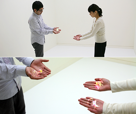展示空間の中に進み,手のひらを天井に向けるような動作をすると,差し出した手のひらに映像が表示されます.それぞれの手には別々の映像が表示されていて,二つの手をくっつけることで,二つの映像が組み合わさって新しい別の映像が再生されます.さらにこの新しい映像を片手において,逆の手に次の映像を捕まえ,それらを組み合わせると,次々に手のひらの映像の世界が展開してゆきます.