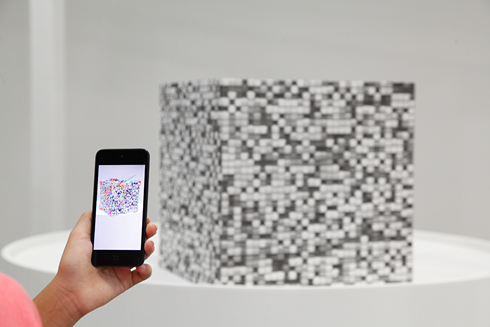 点から線へ,線から正方形へ,正方形から立方体へ,そしてもうひとつの方向をもつ超立方体へ.目の前の立方体がもうひとつの次元をもったとしたらと考えられて作られた,実際には見ることのできない超立方体をAR技術によって見ることができます.